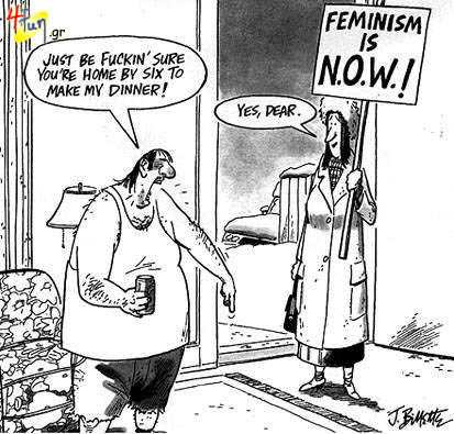 Επίσης, στα πλαίσια του γάμου η σχέση είναι ανισόρροπη. Ο άνδρας μπορούσε να βγαίνει με τους φίλους του και να διασκεδάζει ή να πηγαίνει εκδρομές χωρίς να λογοδοτεί για το που ή με ποιους ήταν. Η γυναίκα όμως έπρεπε να είναι κλεισμένη στο σπίτι και κύριος σκοπός της ζωής της ήταν να το φροντίζει και να καλύπτει τις ανάγκες του άντρα της, και μάλιστα χωρίς να ξοδεύει πολλά. Ο ρόλος της νοικοκυράς ήταν ο μόνος ρόλος που επιφύλασσε η κοινωνία για τις γυναίκες. Το χειρότερο από όλα όμως ήταν ότι η προσφορά αυτή της γυναίκας, που θεωρούνταν αυτονόητη και πάνω σ' αυτή βασίζονταν η ζωή μιας οικογένειας, δεν είχε σε καμία περίπτωση την αναγνώριση που της άξιζε, αν τυχόν είχε αναγνώριση καθόλου. Πρόκειται λοιπόν για μια παραδοσιακή, ανδροκρατούμενη κοινωνία που αναπαράγει το πρότυπο του άνδρα- αφέντη και της υποταγμένης γυναίκας, της υποχρεωμένης με υπομονή και υπακοή να ακολουθεί τις επιθυμίες του άντρα της, όποιες κι αν είναι αυτές...
